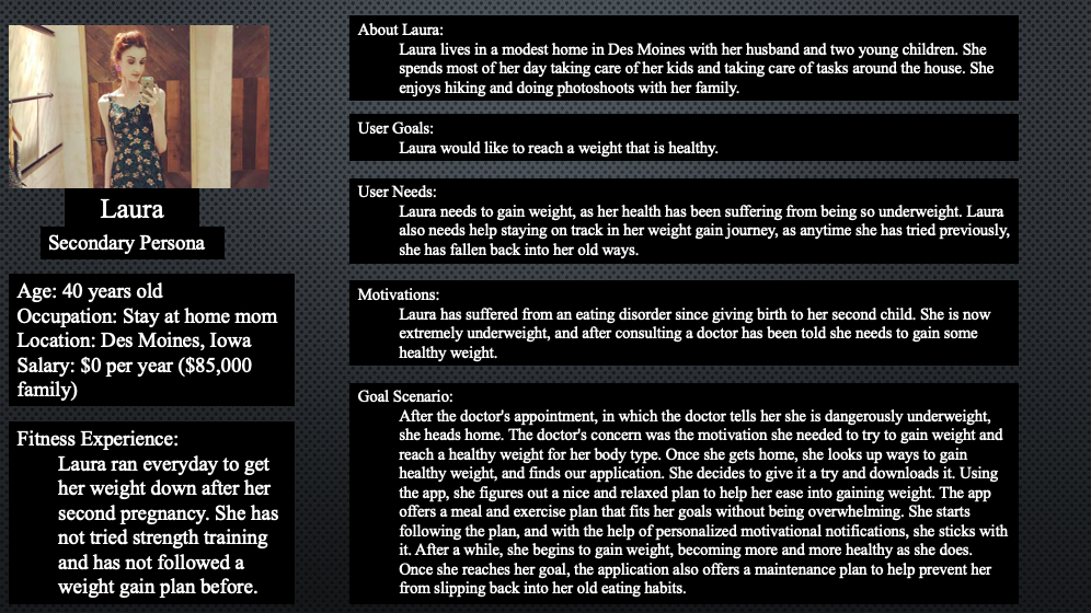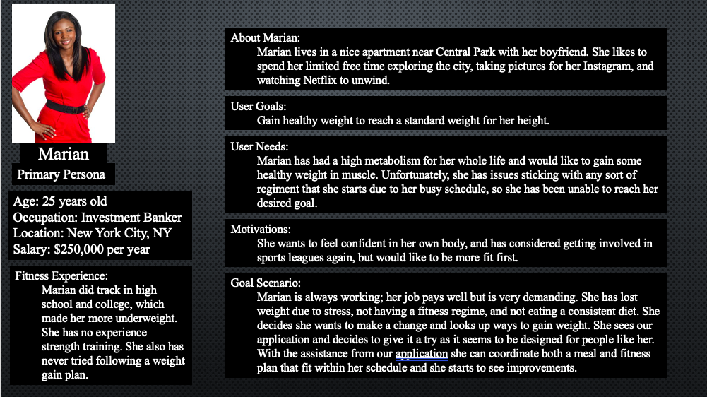 To provide a visual understanding of my consumer base, I generated primary, secondary, and anti personas for potential users of my platform. I intentionally made my personas as diverse as possible, while still making them relevant users. Using these personas and information from interviews, I was able to refine my primary user group: underweight individuals who would like to gain healthy weight, but do not know how to do so effectively.