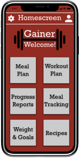 Using Adobe XD, I designed a mid-fidelity prototype with the intention of providing more instruction in my design to guide the user. I chose a color palette that encouraged hunger, and created a logo that represented the importance of exercise in gaining healthy weight.